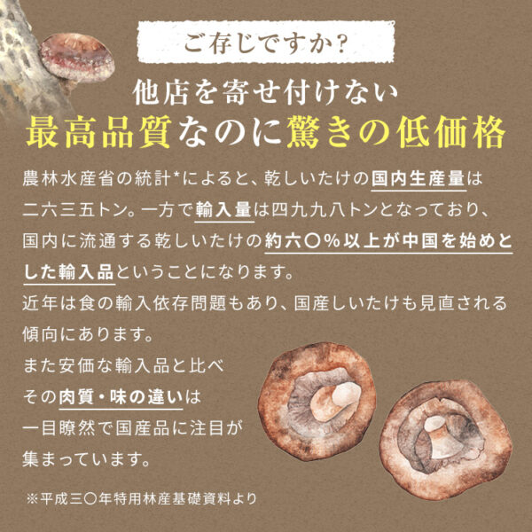 九州産原木干し椎茸500gを送料無料の驚きの価格で!大分県または宮崎県産の原木干しシイタケの味に感動しませんか?